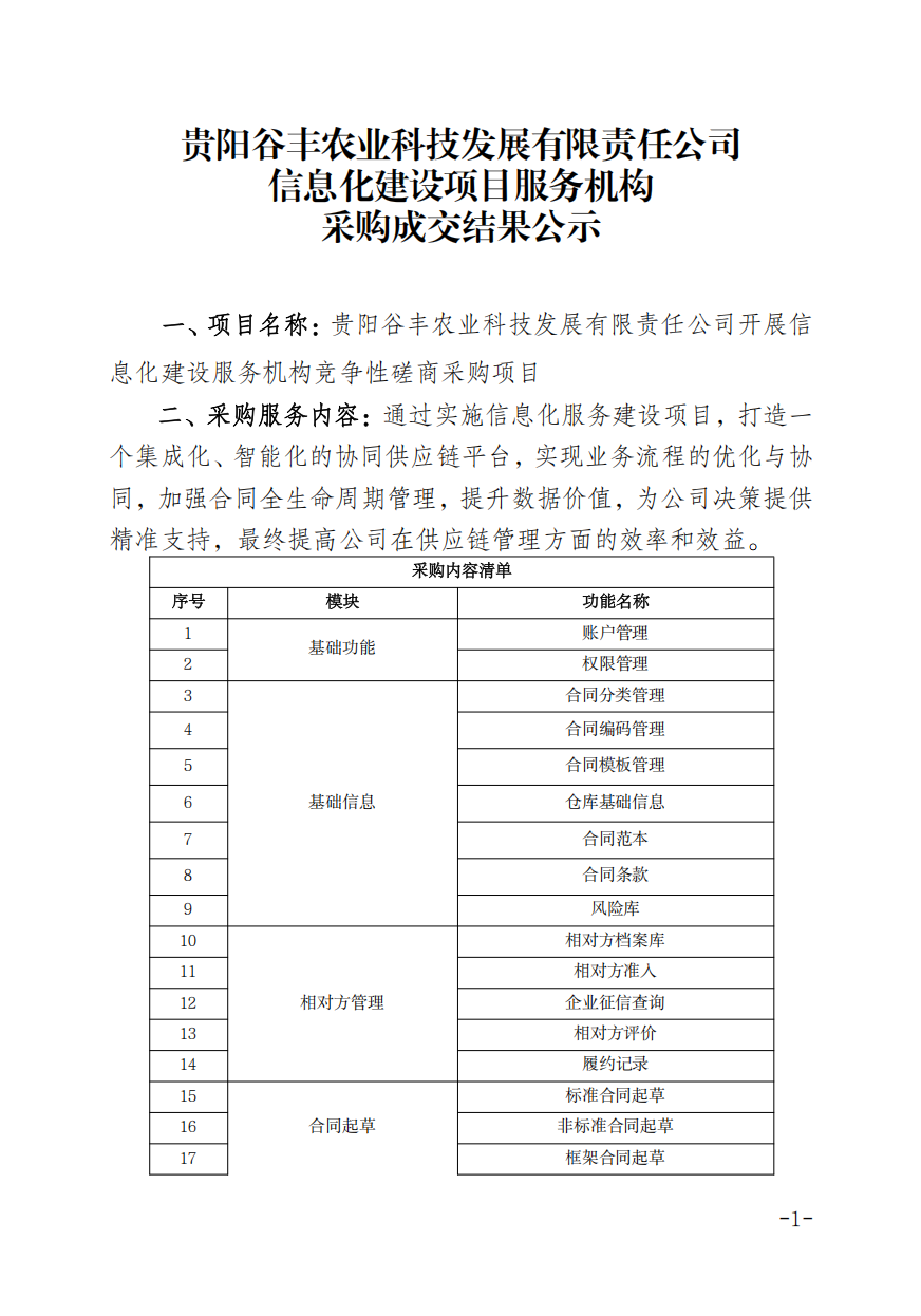 贵阳谷丰农业科技发展有限责任公司 信息化建设项目服务机构 采购成交结果公示